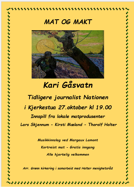 Men utgangspunkt i målene for grønne menigheter og diakoniplanen i Nannestad, inviterer Grønn kirkering og Holter menighetsråd til temakveld om mat og makt.